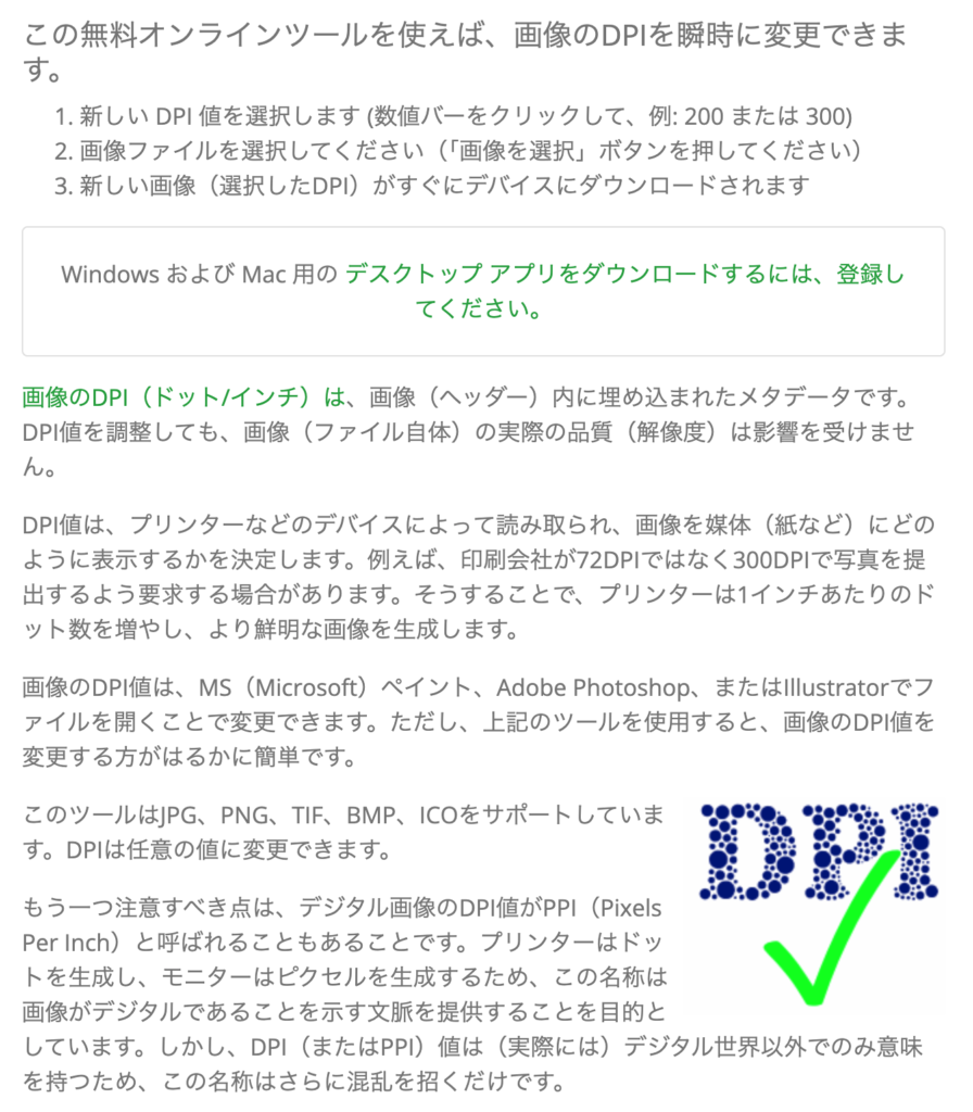 DPI Converterのサイト上には、英語での説明が記載されていますので日本語に翻訳しておきました。